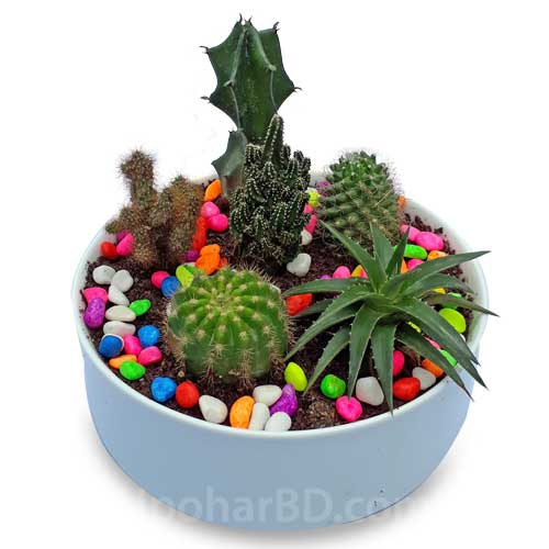 An oasis of love for the person that you care for the most ! This exclusive presentation of three cactuses arranged with coloured stone and live fern in a classy ceramic pot can be the very best gift for anyone. Pot diameter is 12-14 inches. Design of delivered product may vary from the image as the best quality live cactus will be used to design the oasis.