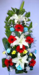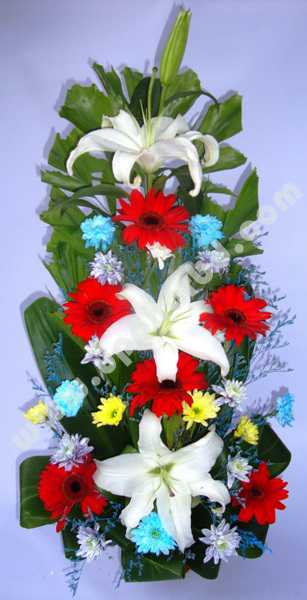 Bouquet with 3 lilies, 7 gerbera daisies, mix of chrysanthemums and all decorated with sago palm leaves. We delivery gift to all cities of Bangladesh and flower bouquets are available for urgent and same day gift delivery in Dhaka. Flowers in this bouquet are mix of local and imported product in Bangladesh. Color and design of delivered item may differ depending on current availability.