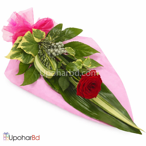 This is an elegant looking hand bouquet with a single imported red rose. The main attraction of this bouquet is the arrangement. The rose is decorated with money plant and another plant with big green leafs with creamy white border. These will be wrapped with colorful ribbons and pink tissue paper. The whole arrangement of red, green and pink will make the bouquet so classy that you can order and send this for any occasions.