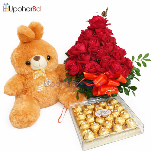 Order online and surprise your loved ones at any occasion in Bangladesh. This special gift package includes a Teddy Bear General, Ferrero Rocher (Big) and a bouquet of 30 Res roses. Package goes with a greetings card matched with the occasion and your wish. Please select gift occasion, and provide card wish at checkout.